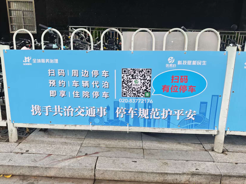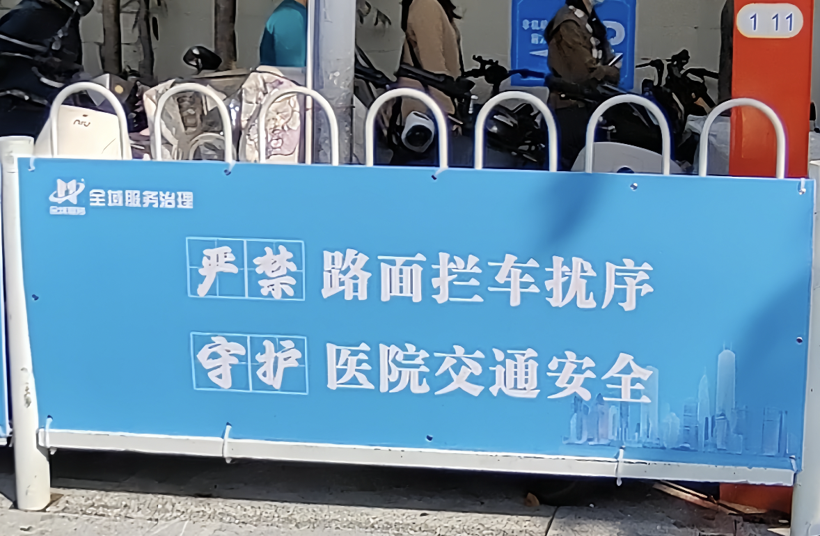 如今开车到中山二路,沿线就能看到一批引导设施。其中既有政府设立的警示牌,醒目印着“严禁路面拦车扰序,守护医院交通安全”的标语,用于规范就医秩序;也有公益引导牌,蓝白配色的牌面清晰展示着“医易泊”服务二维码,搭配“携手共治交通事,停车规范护平安”的指引语,方便车主扫码获取周边车位信息与预约服务,实现从秩序警示到智慧服务的衔接。