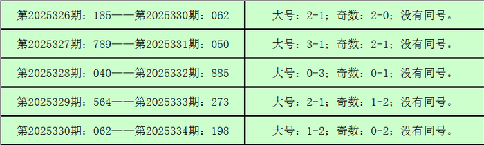 所以,3D第2025305期开出奖号:310,其大小比为0:3,奇偶比为2:1,012路比为2:1:0,与3D第2025335期奖号可能有同号。