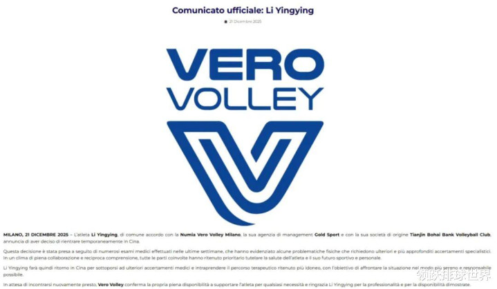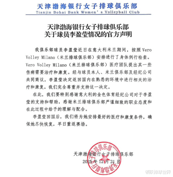 与此同时,天津渤海银行女排俱乐部同时发布了关于李盈莹的官方说明,证实李盈莹返回国内进行伤病治疗和康复,并强调这一决定是与米兰俱乐部、经纪公司及球员本人多方共同协商后做出的结果,种种迹象表明,李盈莹暂别赛场,专注康复,已经成为新赛季的既定安排。