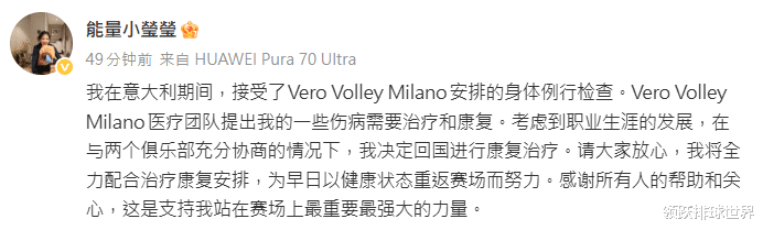 据悉,在米兰期间,李盈莹接受了俱乐部安排的身体检查,米兰医疗团队在检查后提出其身体状况存在需要康复的部位,建议暂时不要高强度参与比赛,出于对职业生涯长远发展的考虑,她与俱乐部商议后,做出了“回国治疗”的决定,而米兰方面也给予了高度理解和支持。