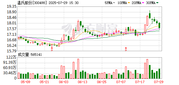 证券时报·数据宝统计显示,温氏股份今日收盘价为17.63元,下跌2.06%,日换手率为0.95%,成交额为9.97亿元,全天主力资金净流出6958.81万元,近5日该股累计下跌5.11%,近5日资金合计净流出2.05亿元。